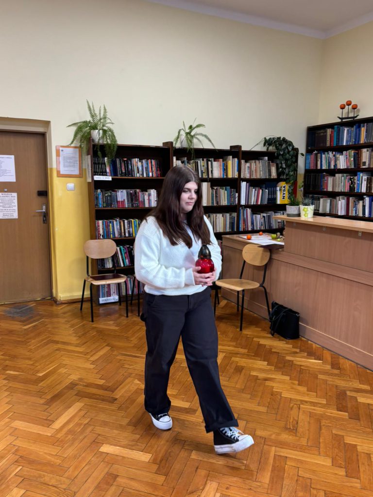 W dniu 19 listopada 2025 roku społeczność naszej szkoły miała zaszczyt uczestniczyć w bibliotece w poruszającym występie „Wspomnienia Listopadowe”, przygotowanym przez uczniów klasy 4TF. Wydarzenie to było hołdem złożonym pamięci zmarłych, stanowiąc ważną lekcję historii i wrażliwości. Centralnym punktem były wzruszające recytacje wierszy poświęconych tematyce przemijania, pamięci narodowej i zadumy. Teksty przeplatały się z nastrojowymi piosenkami, które swoim spokojem i melancholią idealnie dopełniały atmosferę zadumy. Scenografia była niezwykle wymowna. Na specjalnie przygotowanym miejscu płonęły znicze, będące tradycyjnym symbolem pamięci i niegasnącego wspomnienia o tych, którzy odeszli.